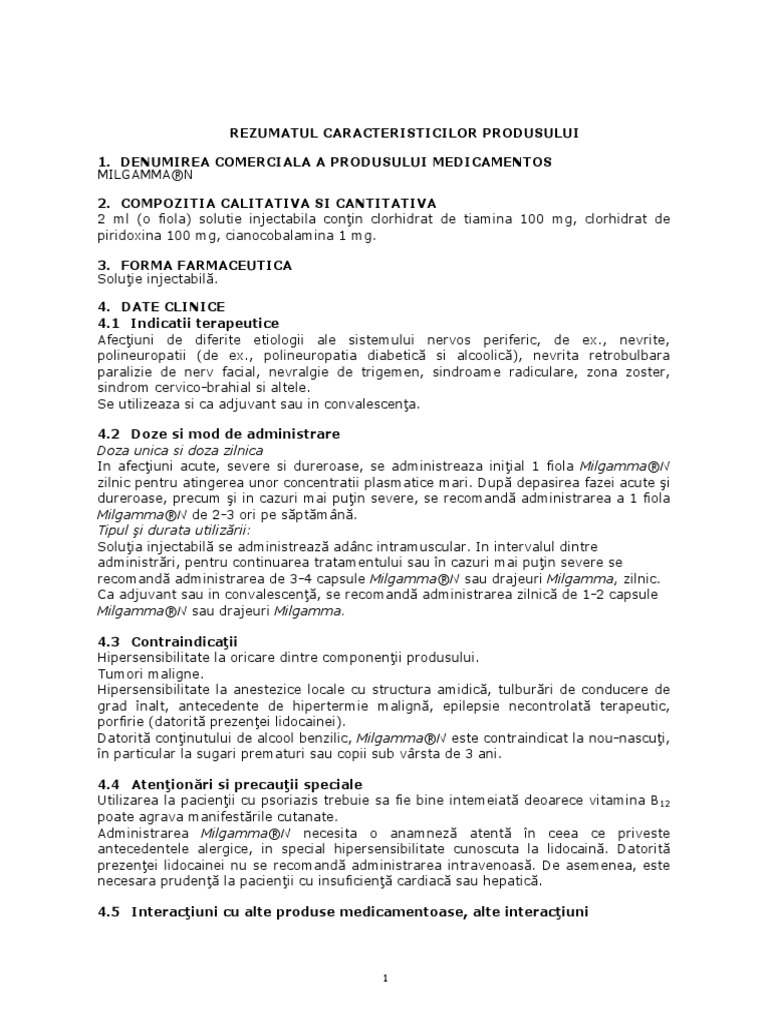 Milgamma n fiole pret. Cutie cu 5 fiole din sticla bruna prevazute cu punct de rupere a cate 1 ml solutie injectabila. Informatii prospect milgamma n fiole indicatii terapeutice afectiuni de diferite etiologii ale sistemului nervos periferic de exemplu nevrite polineuropatii de exemplu polineuropatia diabetica si alcoolica nevrita retrobulbara paralizie de nerv facial nevralgie de trigemen sindroame radiculare zona zoster sindrom cervico brahial si altele. De aceea nu se recomanda administrarea impreuna cu carbonati acetati ioduri sulfat de fier citrat aminoferic clorura de mercur barbiturice riboflavina benzilpenicilina glucoza. Incompatibilitati tiamina este instabila in solutii neutre sau alcaline oxidante sau reducatoare.