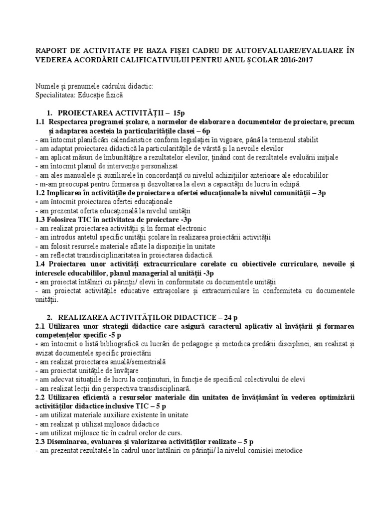 Doc Raport De Autoevaluare Evaluare In Vederea Acordării Calificativului Anual Pentru Cadrele Didactice Din Invăţămantul Preuniversitar Doina Vieru Academia Edu