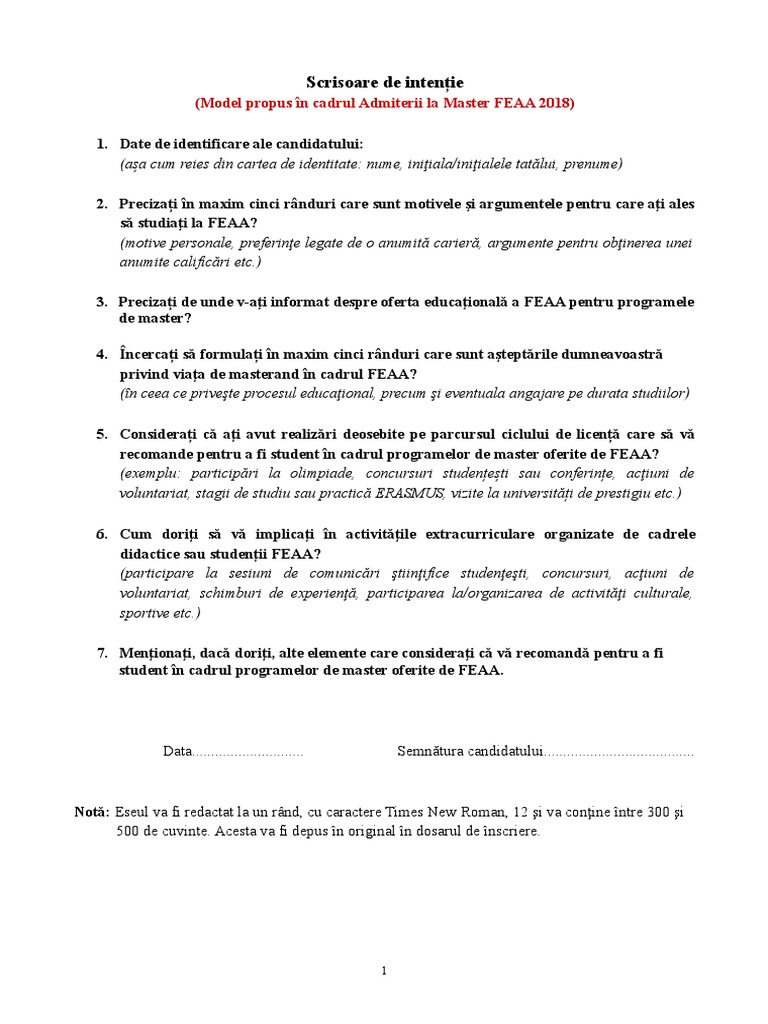 Admitere Master Feaa 2018 Model Scrisoare De Intentie