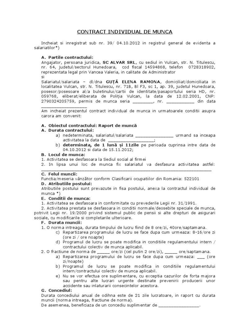 Persoana care presteaza munca este in toate cazurile o persoana fizica. Prevederile prezentului contract individual de munca se completează cu dispoziţiile legii nr. în obiectul dreptului muncii intra raporturile juridice de munca izvorate din incheierea contractului de munca care au anumite caracteristici si anume. Nu se vor efectua ore suplimentare cu exceptia cazurilor de forta majora sau pentru alte lucrari urgente destinate prevenirii producerii unor accidente sau înlaturarii consecintelor acestora.