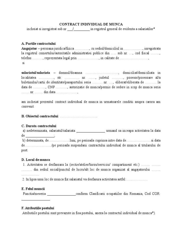 Suspendarea și încetarea contractului individual de muncă. Go to first unread post 2 dr. Ce se scrie la litera b obiectul contractului la contractul individual de munca. Prevederile prezentului contract individual de munca se completeaza cu dispozitiile legii nr.