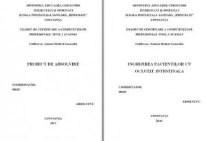 Durerile sunt extrem de puternice atunci când ocluzia se declanşează brusc fiind cauzată de bride încarcerări volvulus etc şi mai puţin intense atunci când. Aceasta licenta trateaza ingrijirea pacientilor cu ocluzie intestinala. Ocluzia intestinala este de fapt un blocaj partial sau total la nivelul intestinelui subtire ori a intestinului gros blocaj care impiedica alimentele digerate dar si lichidele sa fie eliminate. Mai jos poate fi vizualizat un extras din document aprox.