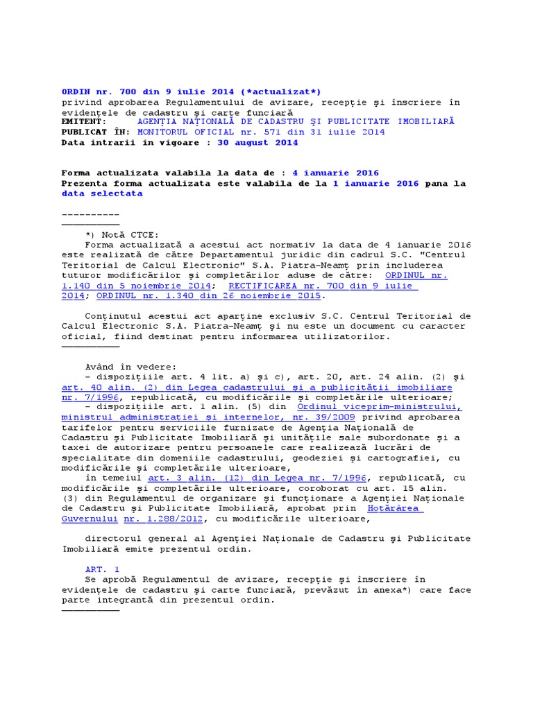 Ordinul 700 actualizat pdf. Ordinul directorului general 107 2010 actualizat anexe la regulamentul ancpi actualizate pdf doc dxf adaugat de admin la data 26 03 2018 in odg 700 2014. Proiect de modificare ordin director general 700 2014. Ministerul dezvoltării regionale şi locuinţei publicat în. A ordinul directorului general al agenției naționale de cadastru și publicitate imobiliară nr.