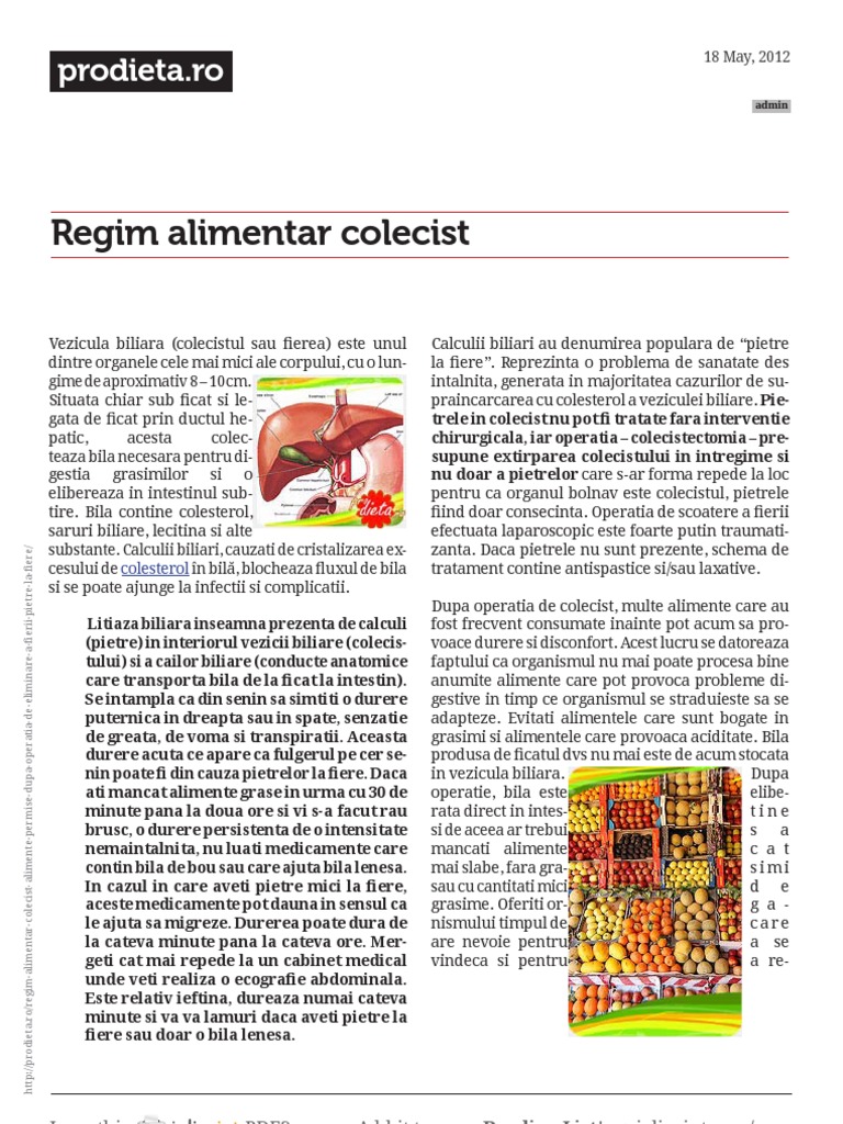 Pietre la fiere regim alimentar. Tratament naturist pentru pietre la fiere regăsim pe bază de anghinare armurariu păpădie. Un regim alimentar rațional și sănătos pentru aceste pietre la fiere poate face ca funcționalitatea bilei să fie mult optimizată. Regimul alimentar este important in bolile de fiere respectarea lui putand sa previna aparitia simptomelor sau complicatiilor desi in general el este la fel pentru toti pacientii o personalizare a sa de catre medic pentru fiecare pacient creste sansele de evolutie favorabila a bolilor colecistului. Desi sunt pacienti care chiar daca au pietre la fiere nu tin niciun fel de regim si nu au niciun simptom sunt numeroase situatii in care altii sunt chinuiti de simptome in ciuda unui regim alimentar strict.