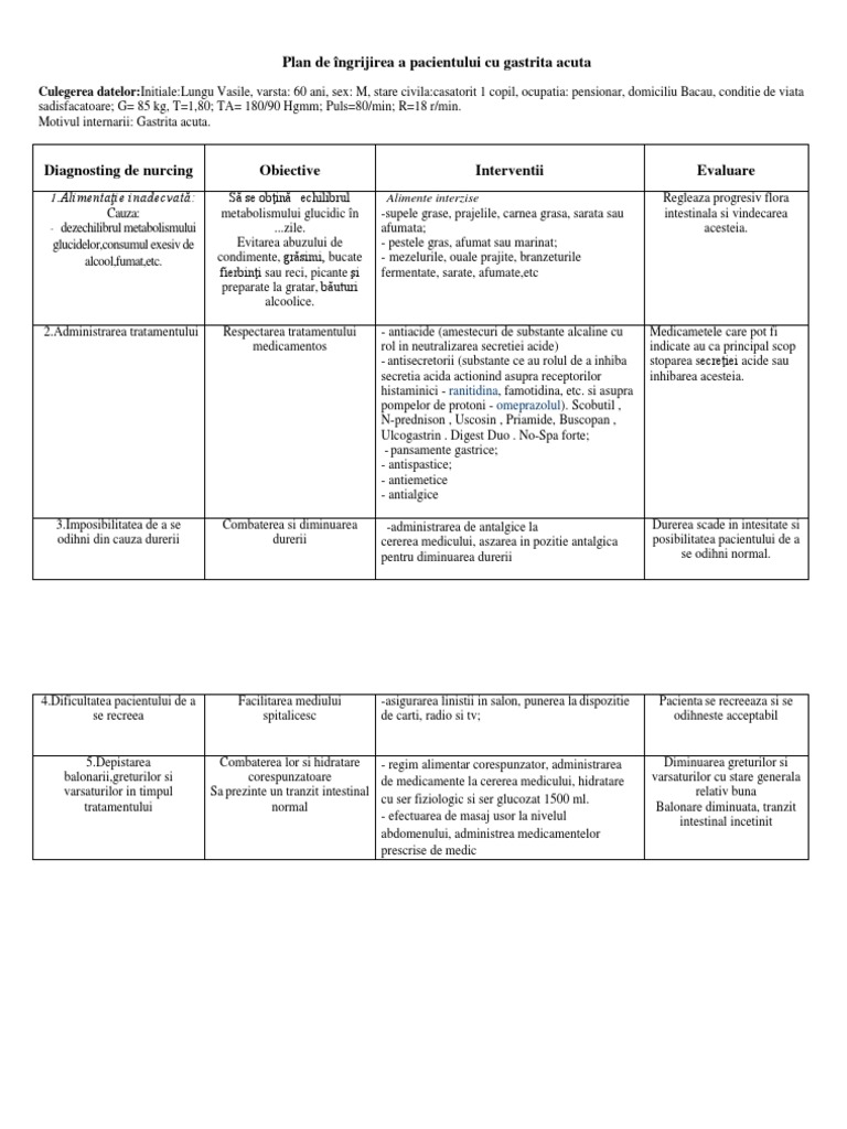 Plan De Ingrijire A Unui Pacient Cu Gastrita