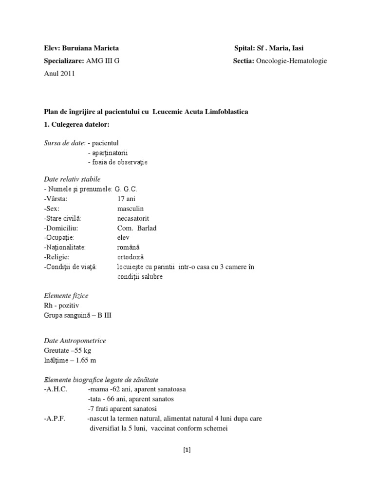 Plan De Ingrijire Al Pacientului Cu Leucemie Acuta Limfoblastica