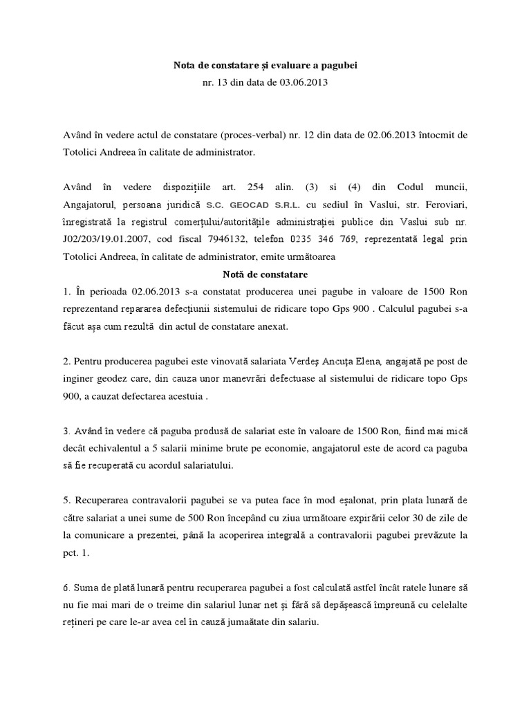 Proces Verbal De Constatare A Pagubelor