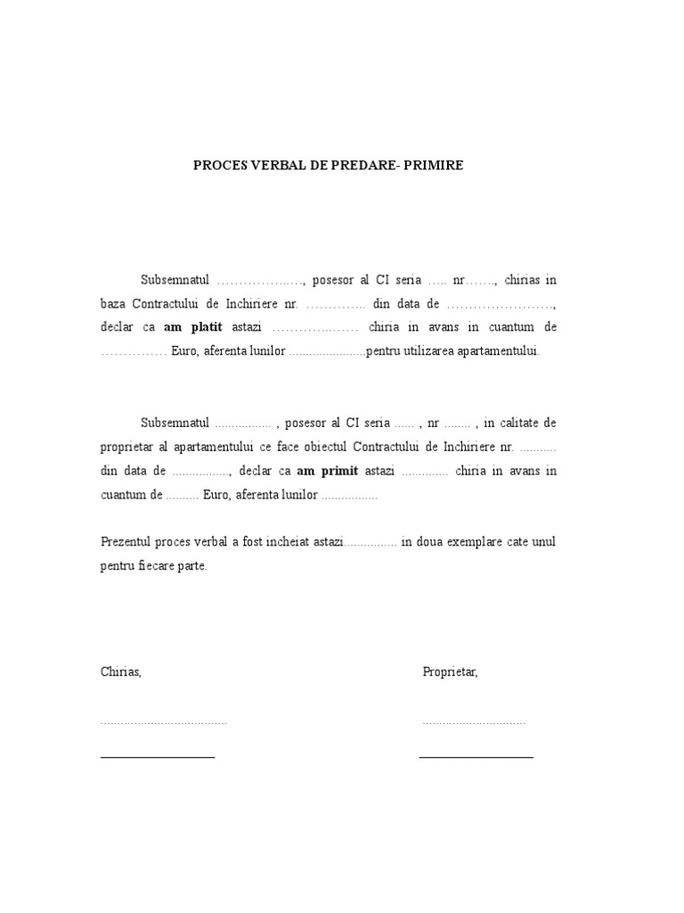 Contract Inchiriere Proces Verbal Predare Spatiu