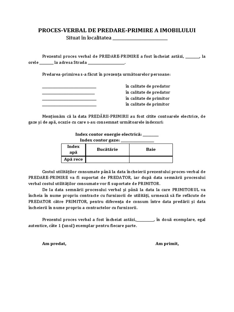 Proces Verbal De Predare Primire Apartament Doc Document